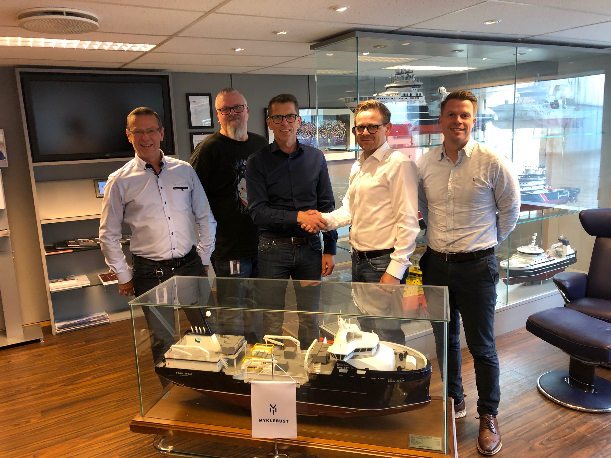 Bildet 1, fra venstre: Tor Ove Stenersen - Prosjektsjef i Sølvtrans, Jan Frågodt – Teknisk Innkjøper Myklebust Verft, Inge Jonny Hide – Daglig Leder Myklebust Verft, Arnfinn Hide – Sales manager Aquaculture MMC First Process, Frank Edvard Vike – VP Sales Onboard & Aquaculture MMC First Process.